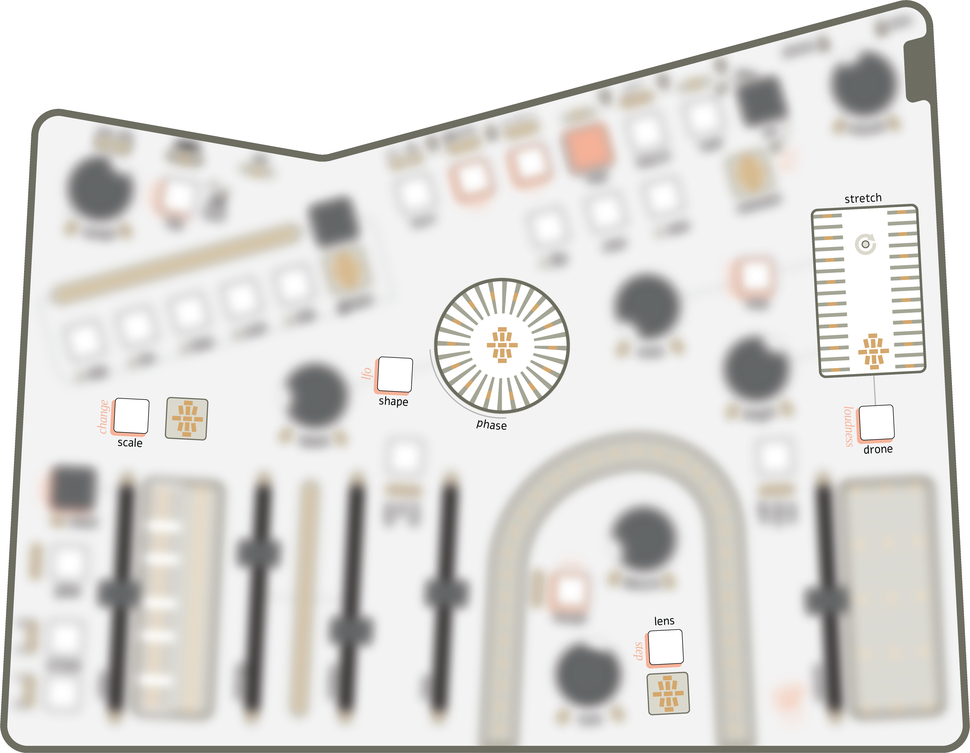 These indicate sequences, which can hold up to 11 steps of state information for their associated parameter. They are found near scale, shape, lens and drone. Tapping the key near these parameters selects a new set of data, which is why we refer to these keys as sequencers. sequences will wrap after the sequencer reaches its last stage.